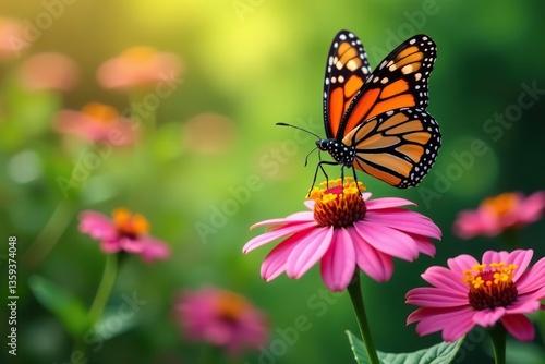 A stunning Monarch butterfly gracefully perched on vibrant pink coneflowers in a beautiful garden setting, vibrant, blooming