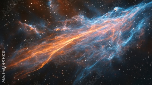 A stunning nebula with orange and blue glowing gas clouds, surrounded by a field of twinkling stars.