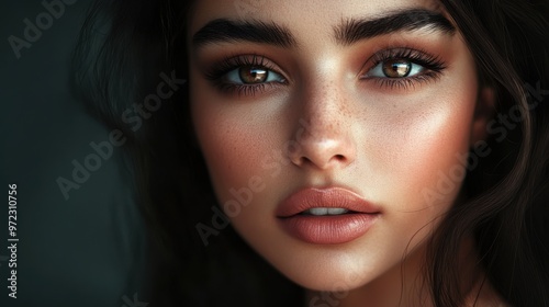 A stunning Persian woman with deep brown eyes and dark brown hair, her soft pink blush
