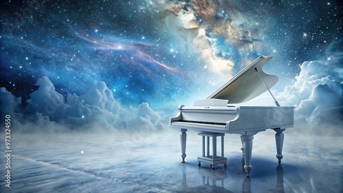 A stunning photo capturing the ethereal beauty of a celestial atmosphere in a cold environment featuring a white piano at eye level, celestial, environment, eye level, atmosphere