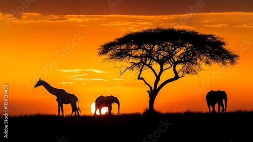 A stunning Serengeti sunset features silhouettes of a giraffe, elephants, and an acacia tree, capturing the essence and beauty of African wildlife and landscapes.