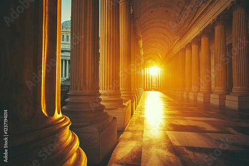 A stunning view of a corridor lined with tall columns, illuminated by the warm glow of a sunset. The sunlight casts long shadows on the polished floor, creating a serene and majestic atmosphere.