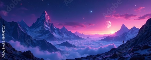 A stunning view of a futuristic landscape with towering mountains and stars in the night sky, surreal, rocks