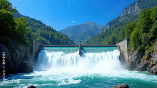 A stunning view of a hydroelectric dam harnessing sustainable green energy with cascading waterfalls set against a scenic mountain backdrop on a clear day.