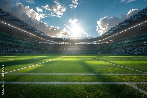 A Stunning View of a Sunlit Soccer Stadium with Lush Green Grass