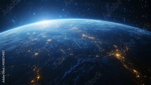 A stunning view of the Earth from space, with a network of lines connecting cities, representing global interconnectedness and communication.