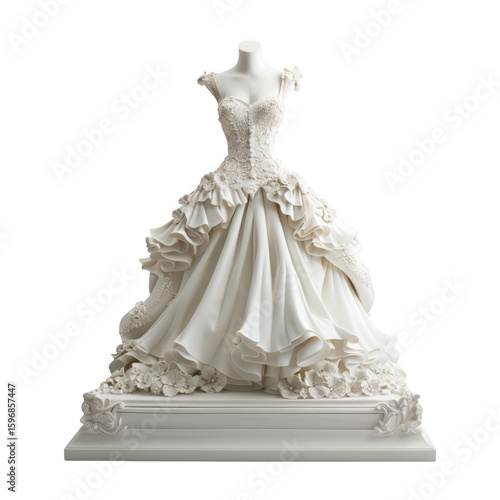 wedding, dress, gown, bride, bridal, fashion, sewing, luxury, elegant, white, ivory, lace, ruffle, flower, floral, detail, ornate, design, style, romantic, classic, vintage, modern, silhouette, mannequin, display, boutique, atelier, ceremony, marriage, celebration, special, occasion, formal, evening, art, sculpture, statue, decoration, ornament, isolated, background, studio, transparent