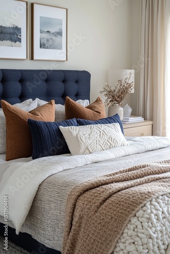 A styled bedroom view with a balanced mix of earthy tones, a textured blue headboard, and soft textiles, creating a cozy and inviting atmosphere.