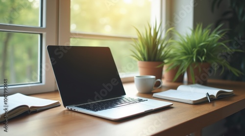 laptop, notebook, hot drink, greenery, organised, clean, productive, workspace, desk, minimalist, modern, stylish, comfortable, efficient, inspiring, creative, focused, motivated, professional