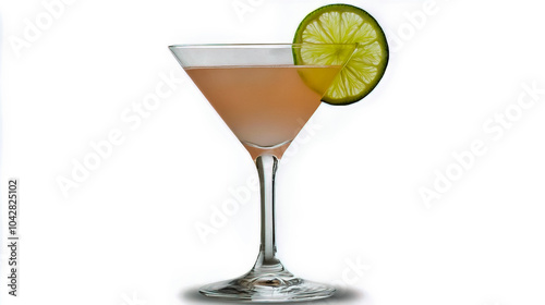 A stylish cocktail in a chic martini glass, featuring a pink hue and garnished with a lime wheel, set against a pure white background.