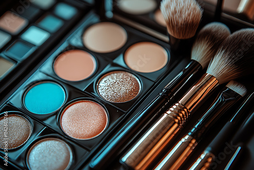 A stylish composition of makeup brushes and compacts arranged on a dark background