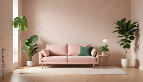 A stylish living room featuring a pink sofa, plants, and a welcoming ambiance.