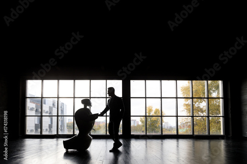 A stylish man communicates with a robot. Cybernetic system today. Modern Robotic Technologies. Humanoid autonomous robot. loft office