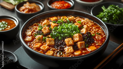 A stylish restaurant setting with a bowl of Jajangmyeon placed in the center.