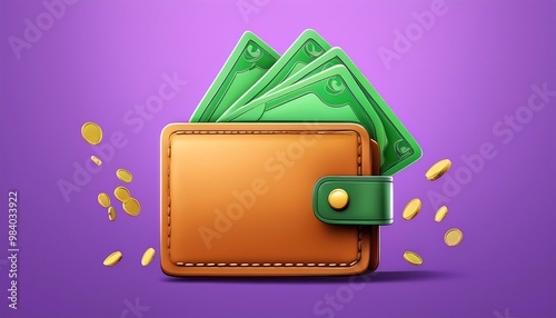 A stylish wallet holds cash and coins, set against a vibrant purple background, symbolizing finance and money management.