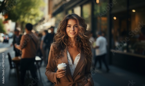 A stylish woman walks to work holding a cup of coffee near an office building. The image depicts a successful businesswoman on her way to work in the city.