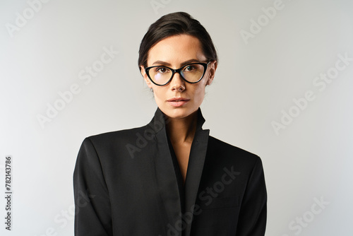A stylish woman wearing glasses and a black jacket poses against a grey studio background.