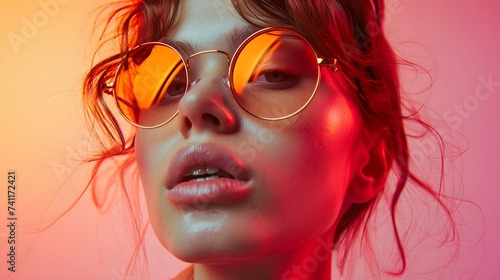 A Stylish woman with sunglasses and red hair in a close-up portrait exuding glamour and summer vibes