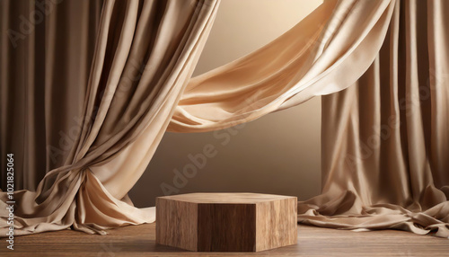 A stylish wooden pedestal with draped curtains, illuminated softly in a minimalist setting for a creative showcase or presentation
