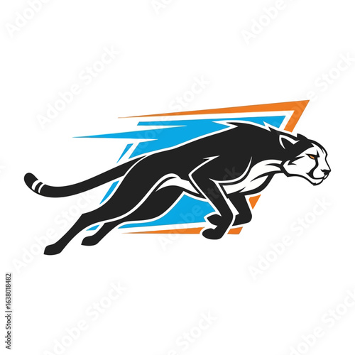 panther, animal, big cat, felino, mammal, wildlife, logotype, design, graphic, illustration, silhouette, black, blue, orange, speed, motion, dynamic, energy, abstract, modern, stylised, icon, emblem, symbol, wild, predator, fast, jumping, leaping, running, agility, strength, powerful, artwork, vector, shape, geometric, element, sport, mascot, wildcat