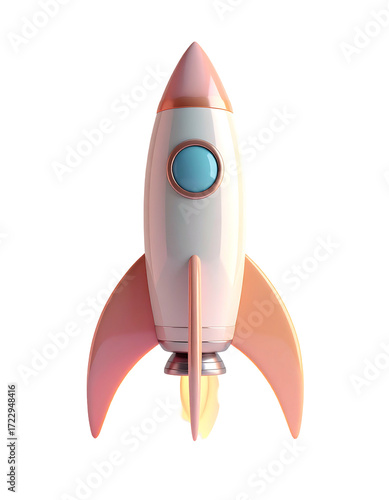 rocket, space, launch, cartoon, three-dimensional, illustration, peach, cream, blue, white, fire, flames, flight, journey, adventure, speed, fast, up, sky, star, cosmos, universe, exploration, discovery, technology, innovation, future, progress, potential, ambition, dream, goal, success, achievement, optimism, hope, growth, forward, movement, power, energy, propulsion, vehicle, craft, design, cute, simple