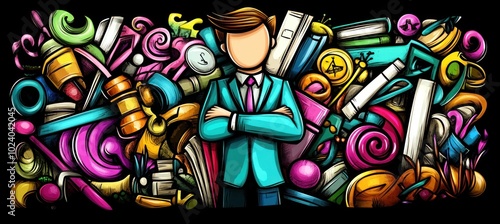 A stylized figure in a suit stands amidst colorful creative tools and materials.
