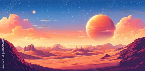 planet, space, landscape, cloud, sky, orange, blue, desert, mountain, horizon, distant, starry, scenic, celestial, bright, atmosphere, twilight, vale, rock, field, light, sunset, dawn, dusk, illustration, artwork, digital, fantasy, environment, terrain, view, surreal, imagined, surface, alien, glowing, vibrant, warm, dreamy, composition, scene, outer, universe