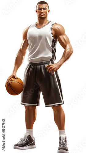 A stylized male basketball player stands confidently with a basketball, showcasing athleticism and sportsmanship.