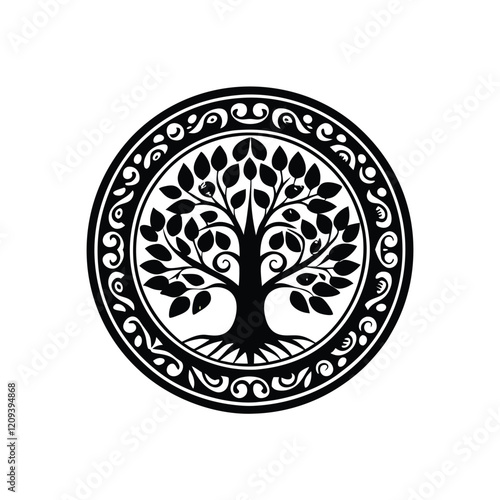A stylized vector logo design featuring a tree shaped like a circle, symbolizing growth and interconnectedness.