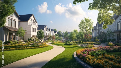 A suburban area with low-rise homes, green lawns, and quiet streets, emphasizing tranquility and order in urban design.