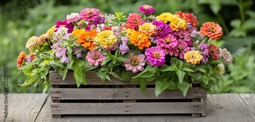 A summery arrangement with zinnias, cosmos, and snapdragons in bright shades, set on a rustic wooden crate.