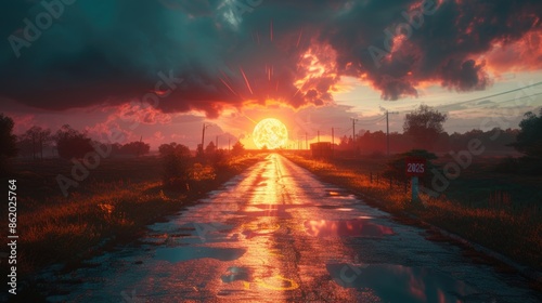 sun, road, sunset, setting, nuclear, explosion, horizon, remote, landscape, hazardous, natural, destruction, evening, aftermath, dusk, asphalt, disaster, radioactive, uninhabited, event, isolated, twilight, eerie, generative, alone, damaged, ai, desolate, deserted, devastated, barren, rugged, desolation, radiance, gloomy, catastrophic, empty, abandoned, skyline, fallout, panorama, haunting, wasteland, vacant, poisonous, forlorn, despondent