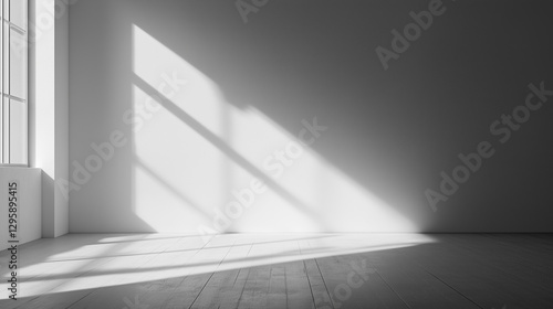 a sunbeam casts a diagonal shadow across a white wall in an empty room