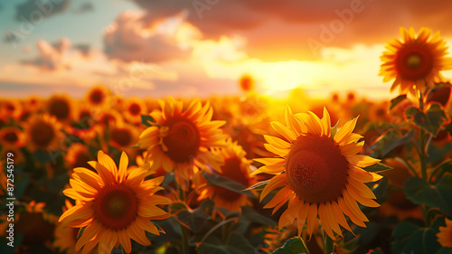 A sunflower field at sunset, with the golden blooms glowing in the warm light. The sky is painted with hues of orange and pink, adding to the beauty.