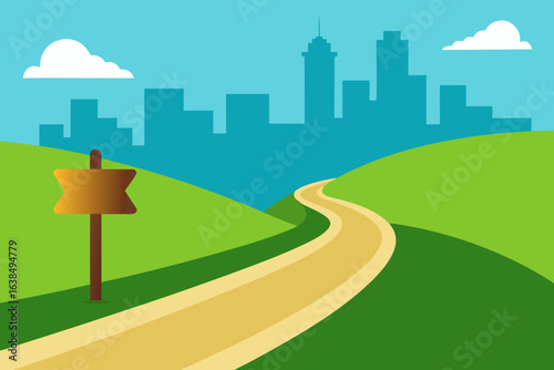 city, landscape, road, sky, vector, illustration, building, tree, grass, nature, town, summer, sun, green, cloud, field, horizon, city landscape, house, cloud, spring, hill, business, highway, design