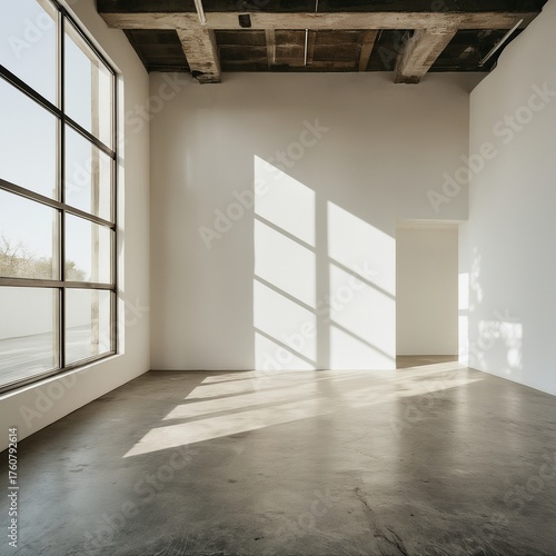 a sunlit, minimalist interior space features large windows casting geometric shadows across a polished concrete floor and stark white walls beneath a rustic wooden beam ceiling.