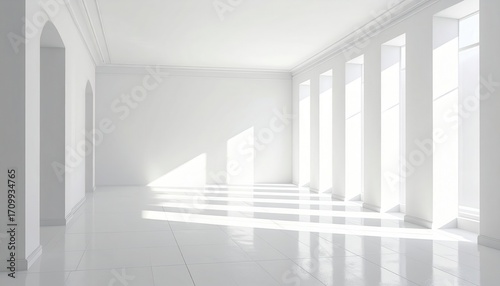 A sunlit, minimalist interior space showcases polished white tiles and tall windows, casting elegant shadows on the floor.