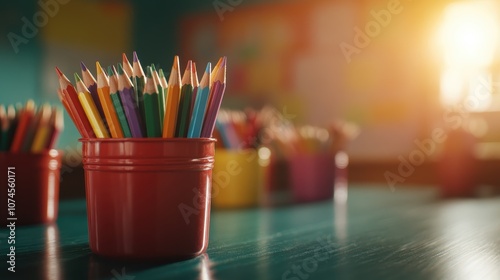 A sunlit space featuring colorful pencils in red and yellow cups on a turquoise table, capturing an enticing and dynamic environment for art or study work.