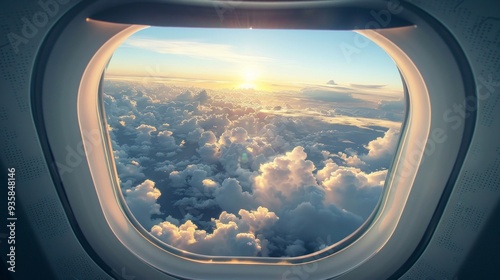 A sunlit view from an airplane window shows clouds and a golden hue. White frame contrasts with blue seat as sunlight adds warmth, creating a high-flying experience.