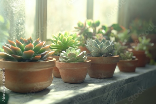 A sunlit windowsill displays a collection of succulents in terracotta pots, showcasing their diverse textures and colors.
