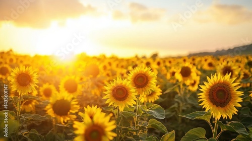 sunrise, over, sunflower, field, bright, gold, flower, nature, summer, yellow, agriculture, sky, sun, green, sunflower, plant, blue, growth, leaf, beauty, blossom, flora, crop, flower, meadow, floral, colours