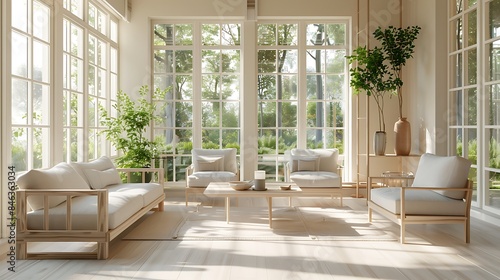 A sunroom with a minimalist Scandinavian style, featuring light wood furniture, neutral tones, and large windows allowing natural light to flood the space