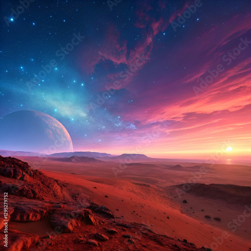A sunset on Mars, with the sky glowing in shades of blue and orange over the rocky horizon.