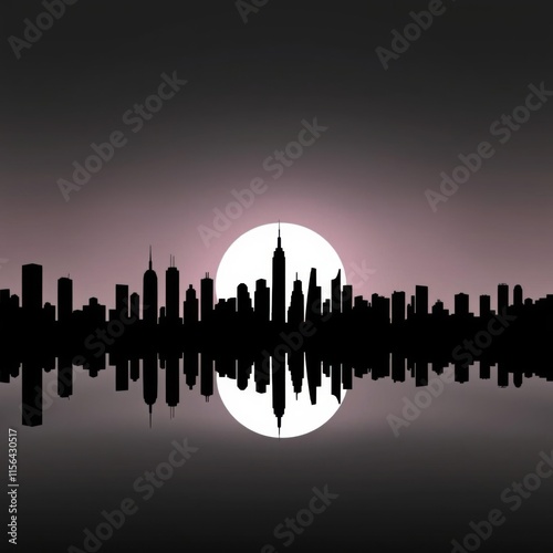 A sunset over a futuristic city skyline reflected in water. skyline silhouette. cityscape illustration architecture city