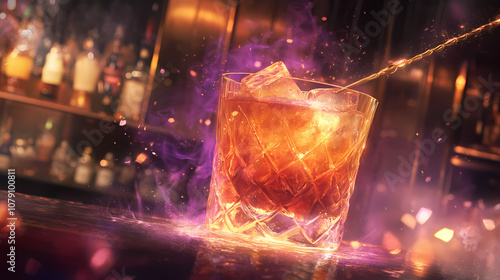 A supernatural scene where a manhattan cocktail is stirred with a magical wand, infusing it with the essence of a bygone era and a touch of timeless elegance. Mystique. Illustration