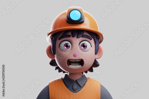 miner, cartoon, three-dimensional, model, rendering, surprised, amazed, astonished, men at work, construction, helmet, orange, vest, safety, industry, mining, underground, excavation, digging, tunnel, light, character, animation, cute, funny, expression, face, open mouth, texture, skin, hair, boy, male, profession, occupation