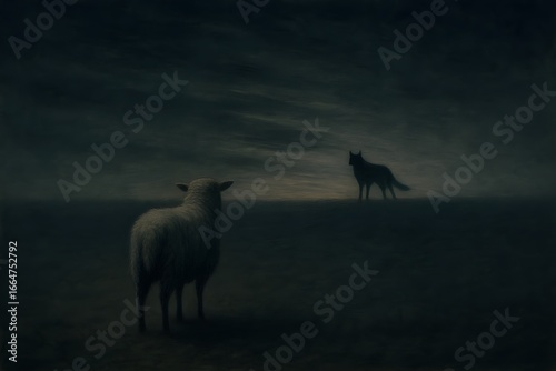 sheep, wolf, encounter, fantasy, nature, forest, predator, prey, animal, wildlife, surreal, fable, metaphor, tension, contrast, wild, serene, gentle, aggressive, danger, balance, harmony, narrative, story, illustration, digital artwork, allegoric, symbolism, natural world, unexpected, meeting, landscape, calm, tense