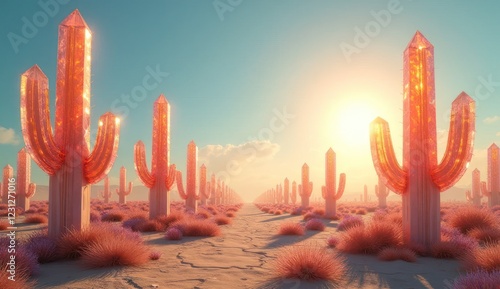 "A surreal desert landscape filled with towering crystal cacti that glow with a warm, amber light. The sun sets in the distance, casting a golden hue over the cracked earth and soft, pink desert shrub