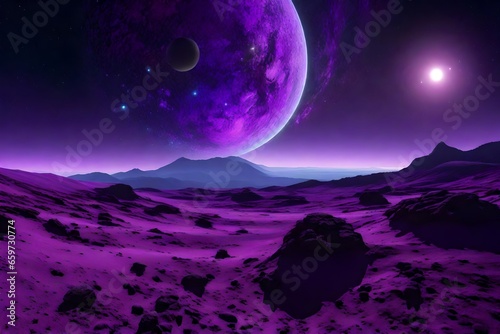 A surreal landscape of a purple planet with three moons and a glowing ring of energy - AI Generative