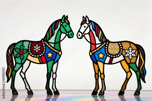 A surreal, simple 3d artwork of a Couple Horse illustrations in stained-glass style with festive motifs, decorative design, white background